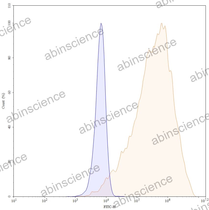 Flow-cytometry using anti-human CD28 antibody. Untransfected cells (blue Histogram) and Transfected cells (Yellow Histogram) were stained with an anti-human CD28 monoclonal antibody (Catalog: HY422207) at a concentration of 5 µg/ml for 30 mins at RT. After washing, bound antibody was detected using a Goat Anti-Mouse IgG H&L Polyclonal Antibody, FITC (abinScience: MF690414) and cells analysed on a NovoCyte Flow Cytometer. |