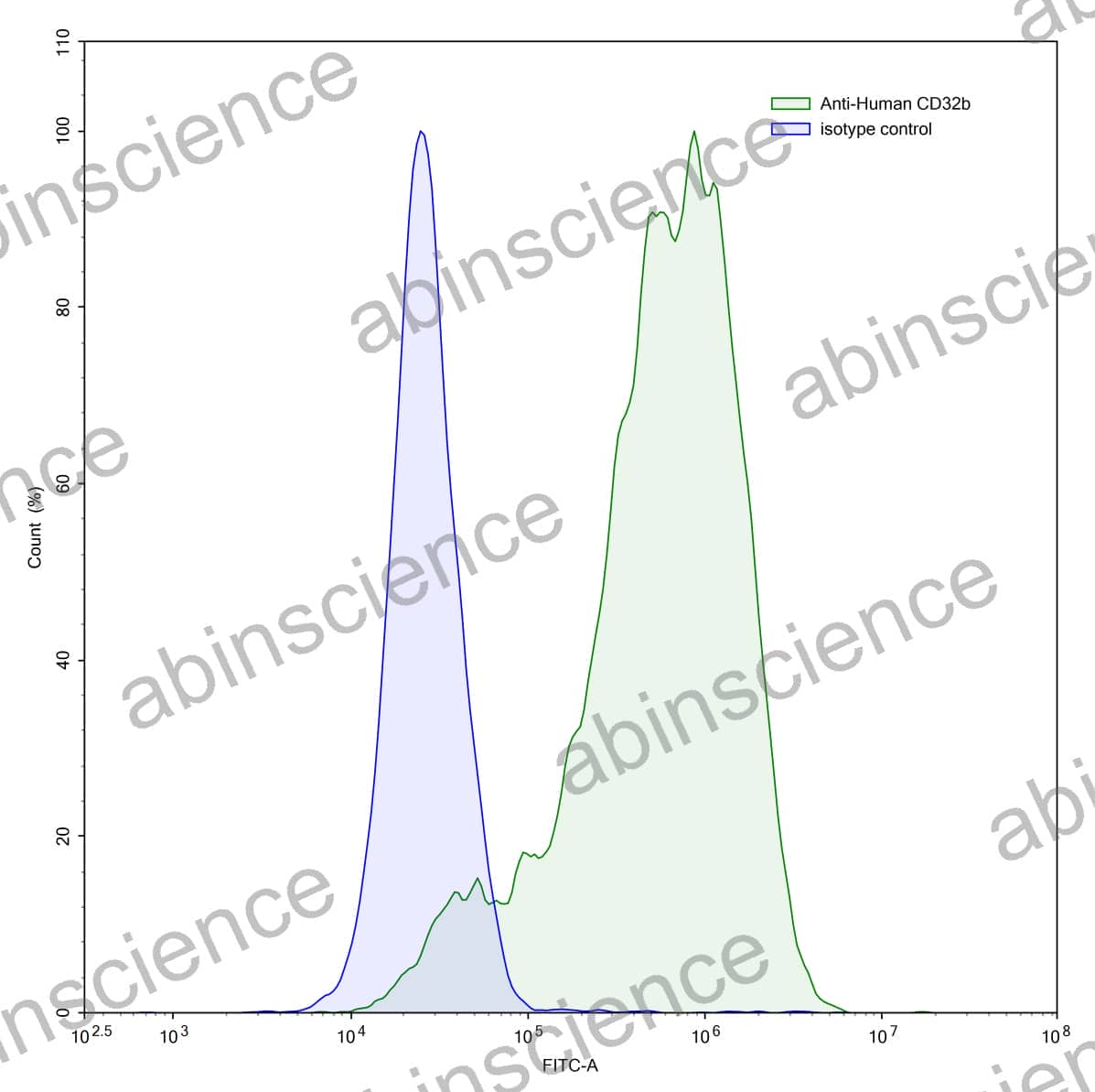 Flow-cytometry using anti-human CD32b antibody.CD32b Transfected CHO cells were stained with an irrelevant antibody (Blue Histogram) or an anti-human CD32b antibody monoclonal antibody (Catalog # HB103107 ,Green Histogram) at a concentration of 5 µg/ml for 30 mins at RT. After washing, bound antibody was detected using a FITC conjugated goat anti-human antibody (Catalog # HF690414) and cells analysed on a NovoCyte Flow Cytometer.