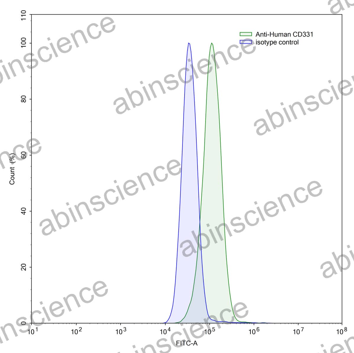 Flow-cytometry using anti-human CD331 antibody.MCF7 cells were stained with an irrelevant antibody (Blue Histogram) or an anti-human CD331 antibody monoclonal antibody (Catalog # HY105107 ,Green Histogram) at a concentration of 5 µg/ml for 30 mins at RT. After washing, bound antibody was detected using a FITC conjugated goat anti-mouse antibody (Catalog # MF690414) and cells analysed on a NovoCyte Flow Cytometer.