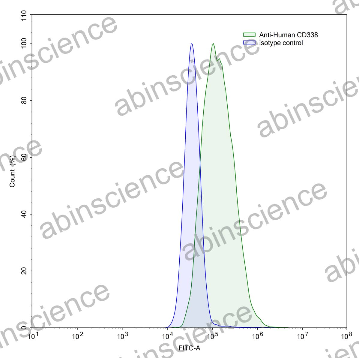 Flow-cytometry using anti-human CD338 antibody.MCF7 cells were stained with an irrelevant antibody (Blue Histogram) or an anti-human CD338 antibody monoclonal antibody (Catalog # HV314107 ,Green Histogram) at a concentration of 5 µg/ml for 30 mins at RT. After washing, bound antibody was detected using a FITC conjugated goat anti-mouse antibody (Catalog # MF690414) and cells analysed on a NovoCyte Flow Cytometer. |