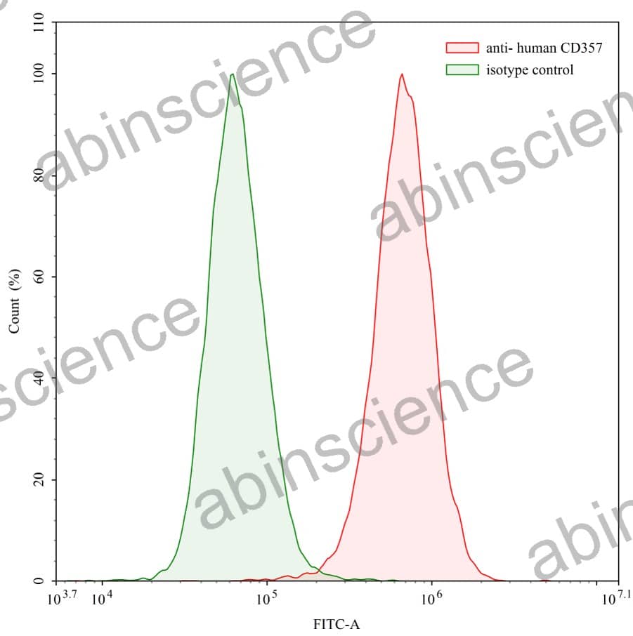 Flow-cytometry using anti-human CD357 antibody. Human RPMI-8226 cell line were stained with an irrelevant antibody (Green Histogram) or an anti-human CD357 antibody monoclonal antibody (Catalog # HV475207 , Red Histogram) at a concentration of 20 µg/ml for 30 mins at RT. After washing, bound antibody was detected using a FITC conjugated goat anti-human antibody (Catalog # HF690414) and cells analysed on a NovoCyte Flow Cytometer.