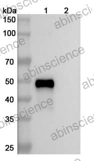 Western blot analysis was performed using anti-IL23A monoclonal antibody at 1ug/mL on various samples. Lane 1: recombinant human IL23A (Catalog No: HV466011) Lane 2: negative control