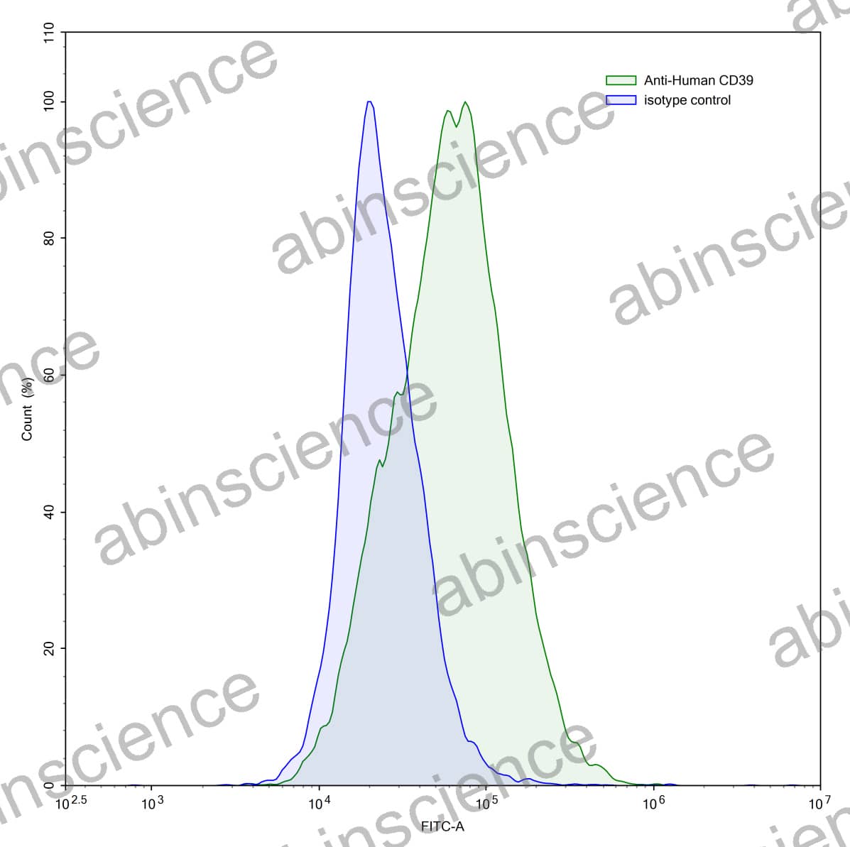Flow-cytometry using anti-human CD39 antibody.CD39 Transfected CHO cells were stained with an irrelevant antibody (Blue Histogram) or an anti-human CD39 antibody monoclonal antibody (Catalog # HW564107 ,Green Histogram) at a concentration of 5 µg/ml for 30 mins at RT. After washing, bound antibody was detected using a FITC conjugated goat anti-mouse antibody (Catalog # MF690414) and cells analysed on a NovoCyte Flow Cytometer. |