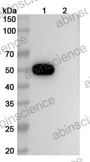 Western blot analysis was performed using anti-CD4 monoclonal antibody at 1ug/mL on various samples. Lane 1: recombinant human CD4 (Catalog No: HF998011) Lane 2: negative control