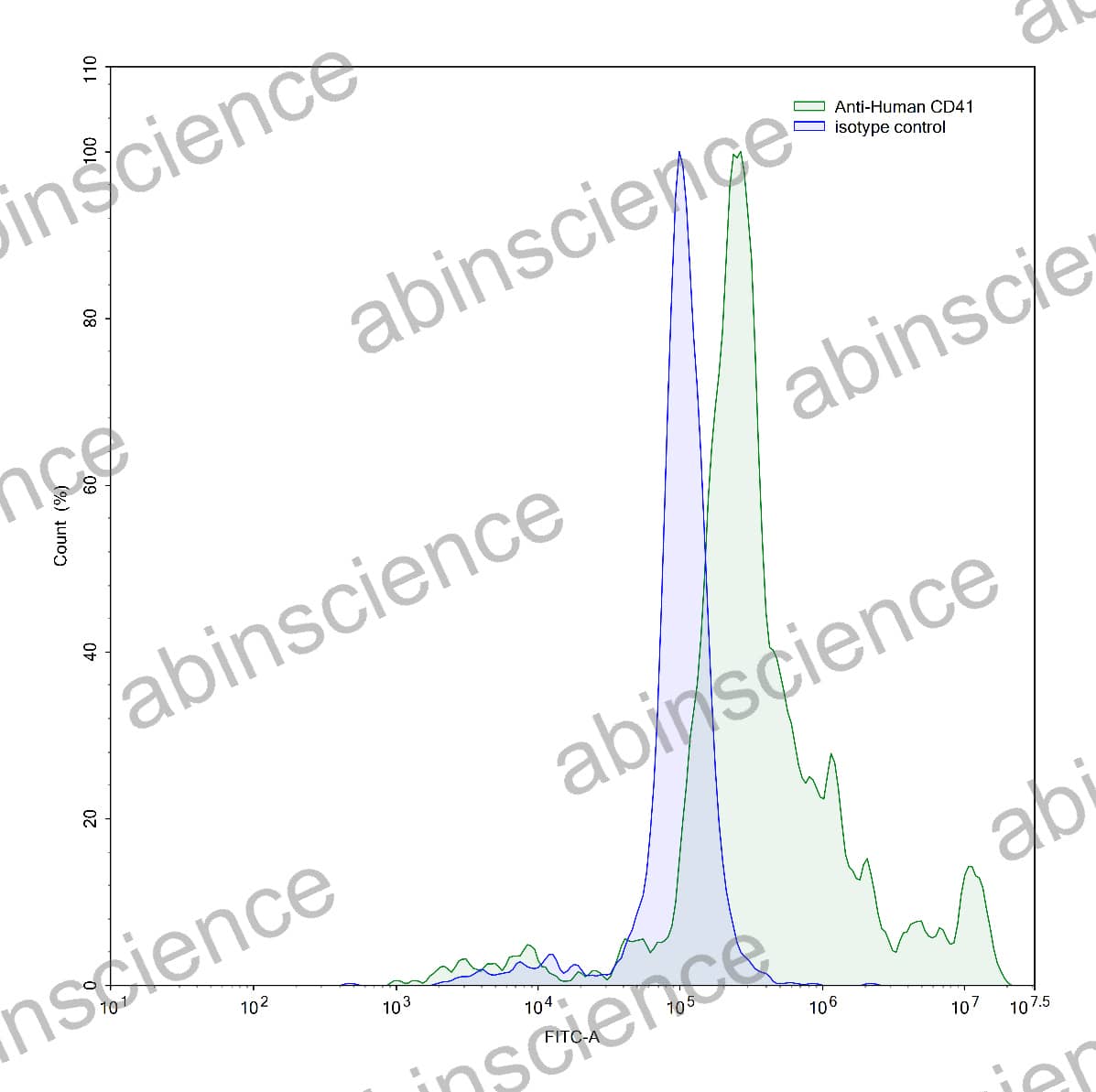 Flow-cytometry using anti-human CD41 antibody.Human peripheral blood monocytes were stained with an irrelevant antibody (Blue Histogram) or an anti-human CD41 antibody monoclonal antibody (Catalog # HY355207 ,Green Histogram) at a concentration of 5 µg/ml for 30 mins at RT. After washing, bound antibody was detected using a FITC conjugated goat anti-mouse antibody (Catalog # MF690414) and cells analysed on a NovoCyte Flow Cytometer. |