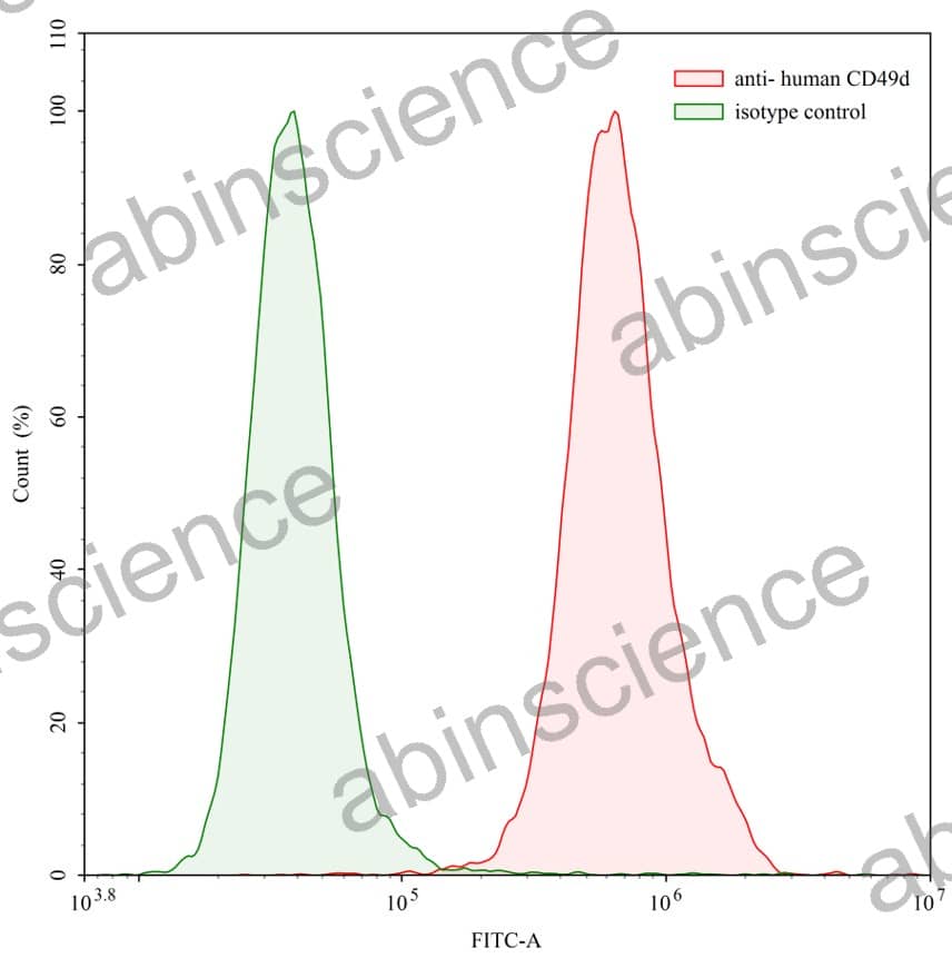 Flow-cytometry using anti-human CD49d antibody. Human Jurkat cell line were stained with an irrelevant antibody (Green Histogram) or an anti-human CD49d antibody monoclonal antibody (Catalog # HY596107 , Red Histogram) at a concentration of 20 µg/ml for 30 mins at RT. After washing, bound antibody was detected using a FITC conjugated goat anti-rabbit antibody (Catalog # PTB96441) and cells analysed on a NovoCyte Flow Cytometer.