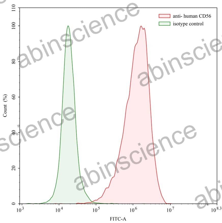 Flow-cytometry using anti-human CD56 antibody. Human SH-SY5Y cell line were stained with an irrelevant antibody (Green Histogram) or an anti-human CD56 antibody monoclonal antibody (Catalog # HY309107 , Red Histogram) at a concentration of 20 µg/ml for 30 mins at RT. After washing, bound antibody was detected using a CoraLite488 conjugated goat anti-mouse antibody (Catalog # MF690314) and cells analysed on a NovoCyte Flow Cytometer.