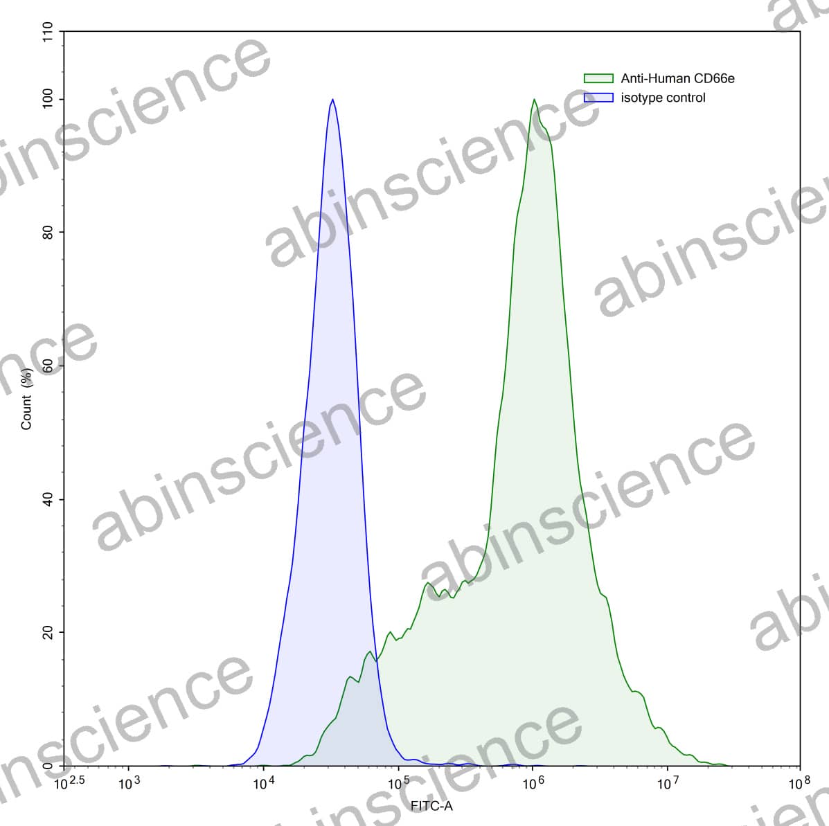 Flow-cytometry using anti-human CD66e antibody.CD66e Transfected CHO cells were stained with an irrelevant antibody (Blue Histogram) or an anti-human CD66e antibody monoclonal antibody (Catalog # HY546307 ,Green Histogram) at a concentration of 5 µg/ml for 30 mins at RT. After washing, bound antibody was detected using a FITC conjugated goat anti-human antibody (Catalog # HF690414) and cells analysed on a NovoCyte Flow Cytometer. |