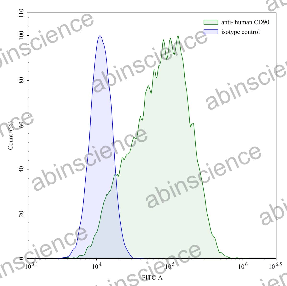 Flow-cytometry using anti-human CD90 antibody.Jurkat cells were stained with an irrelevant antibody (Blue Histogram) or an anti-human CD90 antibody monoclonal antibody (Catalog # HY557107 ,Green Histogram) at a concentration of 5 ug/ml for 30 mins at RT. After washing, bound antibody was detected using a FITC conjugated goat anti-mouse antibody (Catalog # MF690414) and cells analysed on a NovoCyte Flow Cytometer. |