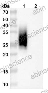 Western blot analysis was performed using anti-CD47/IAP monoclonal antibody at 1ug/mL on various samples. Lane 1: recombinant mouse CD47/IAP (Catalog No: MC359011) Lane 2: negative control