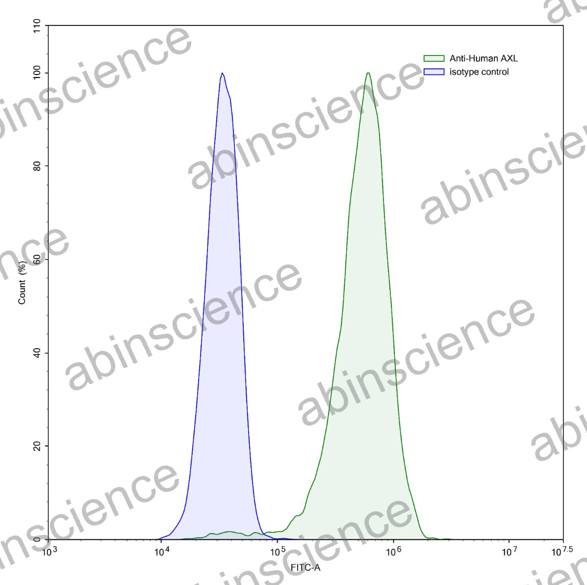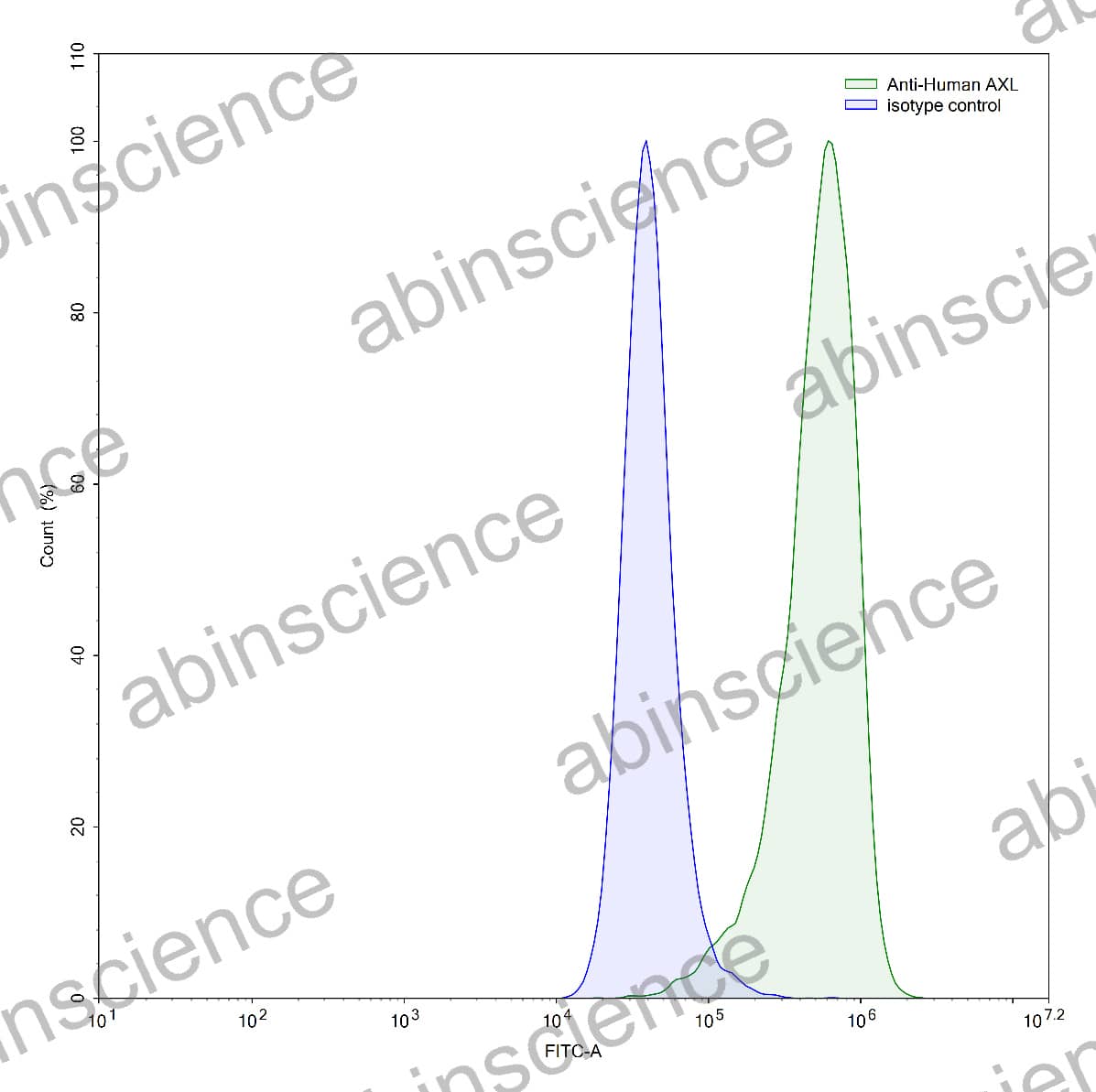 Flow-cytometry using anti-human AXL antibody.U251 cells were stained with an irrelevant antibody (Blue Histogram) or an anti-human AXL antibody monoclonal antibody (Catalog # HB709207 ,Green Histogram) at a concentration of 5 µg/ml for 30 mins at RT. After washing, bound antibody was detected using a FITC conjugated goat anti-mouse antibody (Catalog # MF690414) and cells analysed on a NovoCyte Flow Cytometer. |