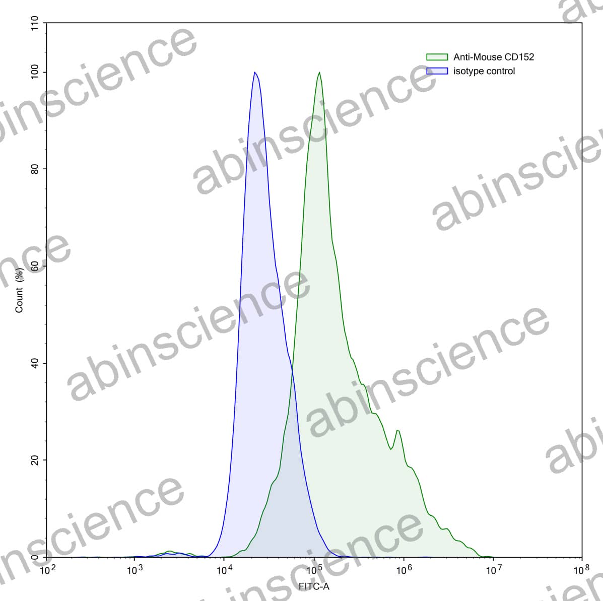 Flow-cytometry using anti-mouse CD152 antibody.CD152 Transfected CHO cells were stained with an irrelevant antibody (Blue Histogram) or an anti-mouse CD152 antibody monoclonal antibody (Catalog # MB651107 ,Green Histogram) at a concentration of 5 µg/ml for 30 mins at RT. After washing, bound antibody was detected using a FITC conjugated goat anti-mouse antibody (Catalog # MF690414) and cells analysed on a NovoCyte Flow Cytometer. |