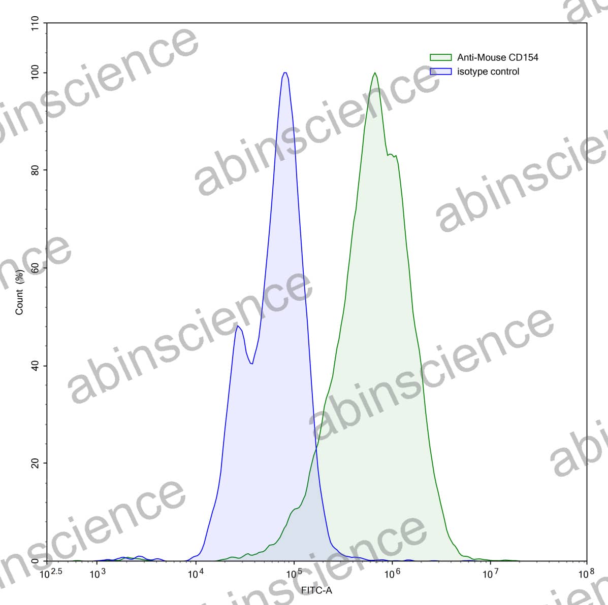 Flow-cytometry using anti-mouse CD154 antibody.CD154 Transfected CHO cells were stained with an irrelevant antibody (Blue Histogram) or an anti-mouse CD154 antibody monoclonal antibody (Catalog # MB199107 ,Green Histogram) at a concentration of 5 µg/ml for 30 mins at RT. After washing, bound antibody was detected using a FITC conjugated goat anti-rat antibody and cells analysed on a NovoCyte Flow Cytometer. |