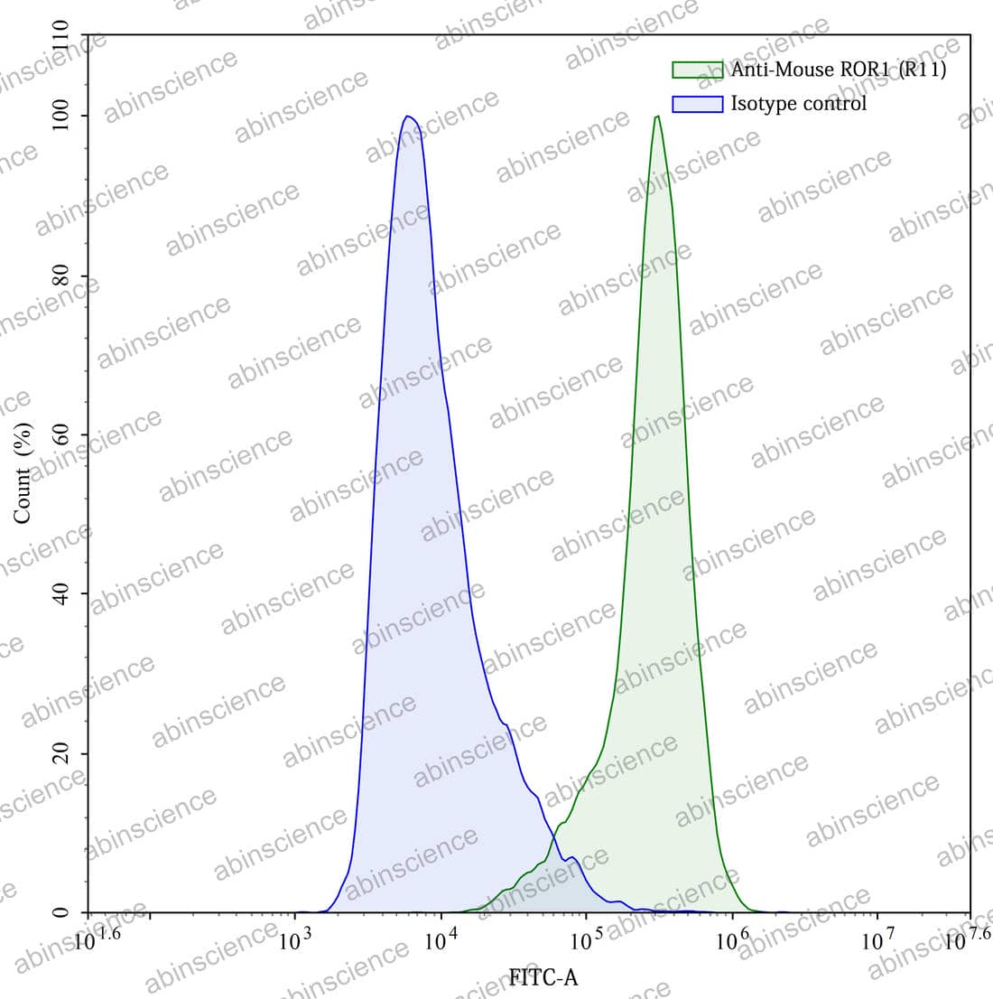 Flow cytometry analysis with Anti-Mouse ROR1 mAb (R11) 5 μg/ml (MX065107) on XtenCHO cells transfected with Mouse ROR1 (green histogram) or the isotype control (FMB96750) (blue histogram). |