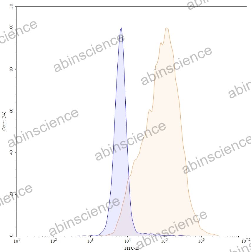 Flow-cytometry using anti-human CD274 antibody. Untransfected cells (blue Histogram) and Transfected cells (Yellow Histogram) were stained with an anti-human CD274 monoclonal antibody (Catalog: MV974207) at a concentration of 5 µg/ml for 30 mins at RT. After washing, bound antibody was detected using a Goat Anti-Mouse IgG H&L Polyclonal Antibody, FITC (abinScience: MF690414) and cells analysed on a NovoCyte Flow Cytometer.