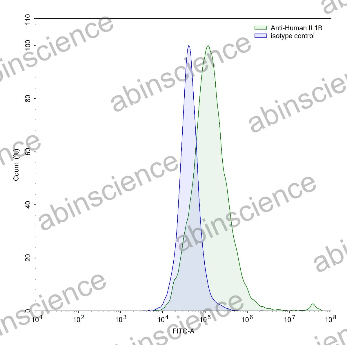 Flow-cytometry using anti-human IL1B antibody.LPS treated THP-1 cells were stained with an irrelevant antibody (Blue Histogram) or an anti-human IL1B antibody monoclonal antibody (Catalog # HF943207 ,Green Histogram) at a concentration of 5 ug/ml for 30 mins at RT. After washing, bound antibody was detected using a FITC conjugated goat anti-mouse antibody (Catalog # MF690414) and cells analysed on a NovoCyte Flow Cytometer.