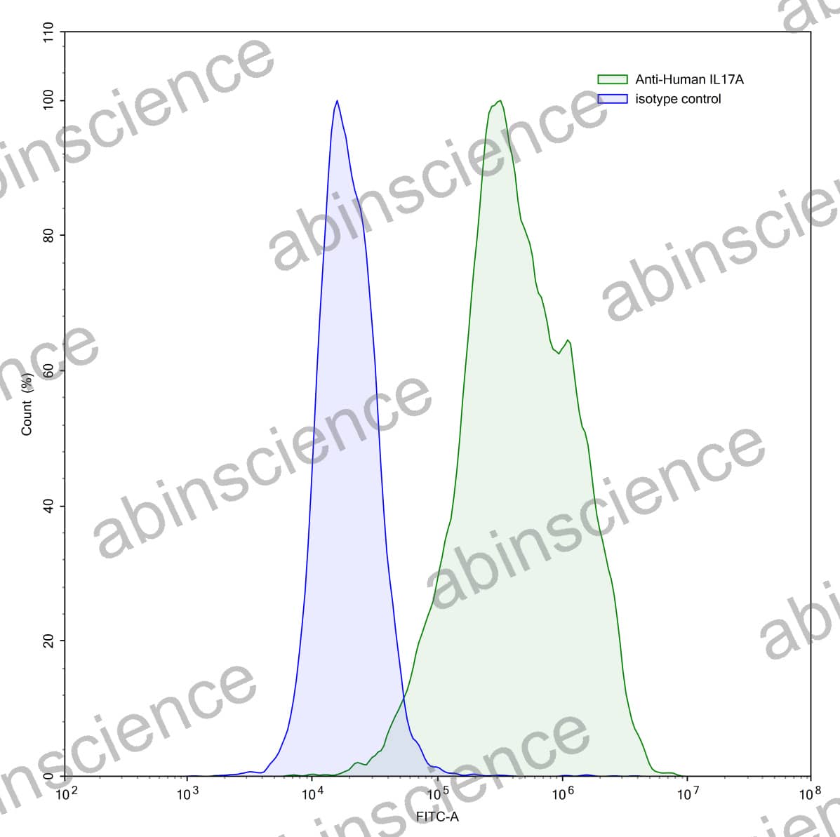 | Flow-cytometry using anti-human IL17A antibody.IL17A Transfected CHO cells were stained with an irrelevant antibody (Blue Histogram) or an anti-human IL17A antibody monoclonal antibody (Catalog # HS856107 ,Green Histogram) at a concentration of 5 µg/ml for 30 mins at RT. After washing, bound antibody was detected using a FITC conjugated goat anti-mouse antibody (Catalog # MF690414) and cells analysed on a NovoCyte Flow Cytometer. |