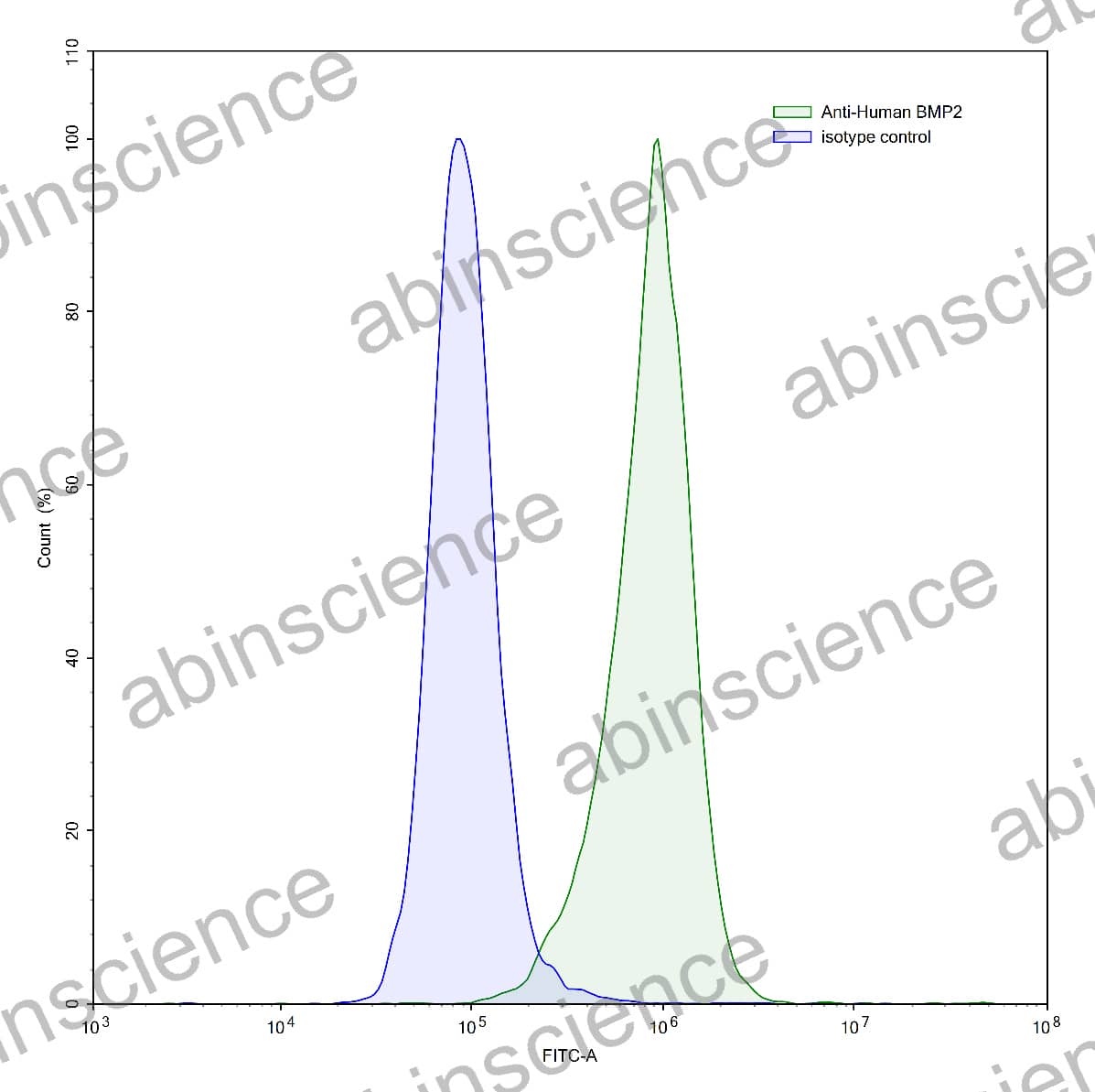 Flow-cytometry using anti-human BMP2 antibody.HeLa cells were stained with an irrelevant antibody (Blue Histogram) or an anti-human BMP2 antibody monoclonal antibody (Catalog # HY576107 ,Green Histogram) at a concentration of 5 µg/ml for 30 mins at RT. After washing, bound antibody was detected using a FITC conjugated goat anti-mouse antibody (Catalog # MF690414) and cells analysed on a NovoCyte Flow Cytometer.