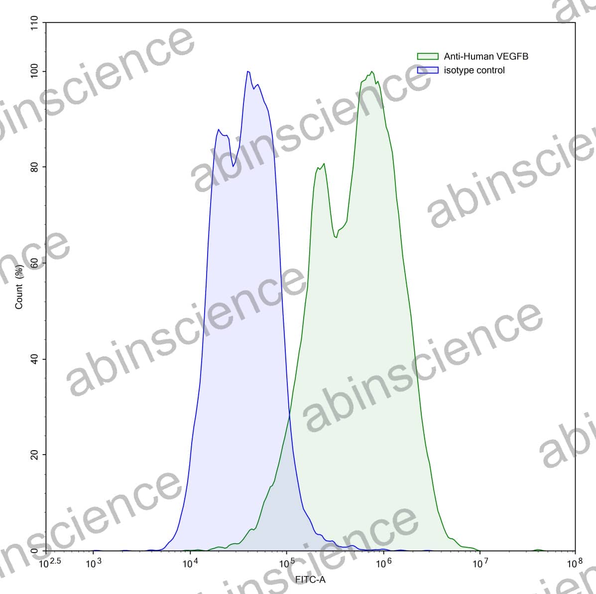 Flow-cytometry using anti-human VEGFB antibody.VEGFB Transfected CHO cells were stained with an irrelevant antibody (Blue Histogram) or an anti-human VEGFB antibody monoclonal antibody (Catalog # HW516107 ,Green Histogram) at a concentration of 5 µg/ml for 30 mins at RT. After washing, bound antibody was detected using a FITC conjugated goat anti-mouse antibody (Catalog # MF690414) and cells analysed on a NovoCyte Flow Cytometer. |