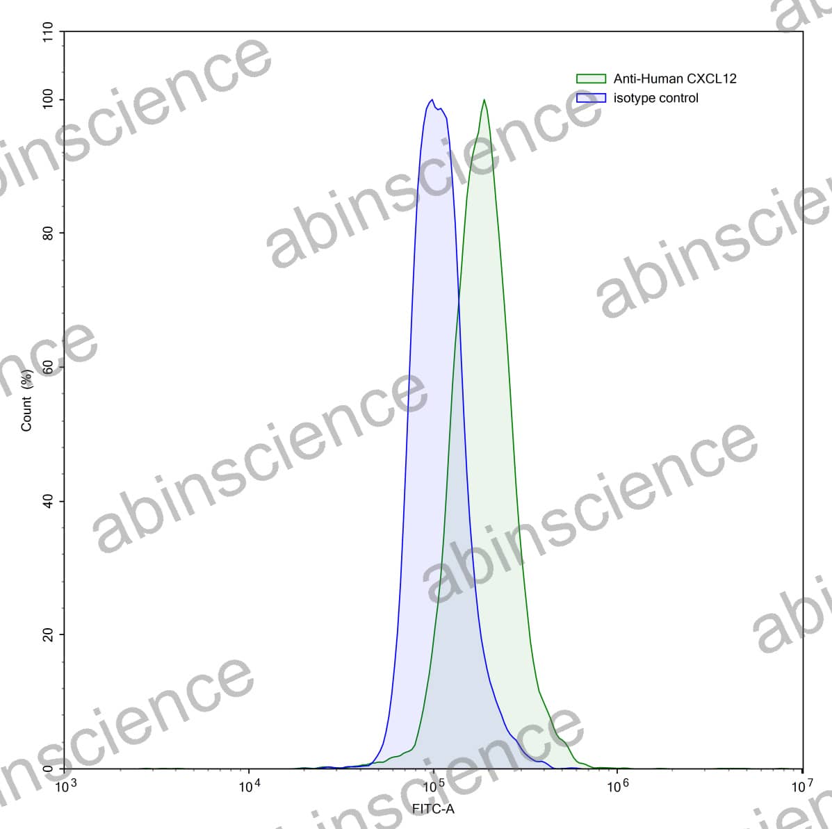 Flow-cytometry using anti-human CXCL12 antibody.MDA-MB-453 cells were stained with an irrelevant antibody (Blue Histogram) or an anti-human CXCL12 antibody monoclonal antibody (Catalog # HW376107 ,Green Histogram) at a concentration of 5 µg/ml for 30 mins at RT. After washing, bound antibody was detected using a FITC conjugated goat anti-mouse antibody (Catalog # MF690414) and cells analysed on a NovoCyte Flow Cytometer. |