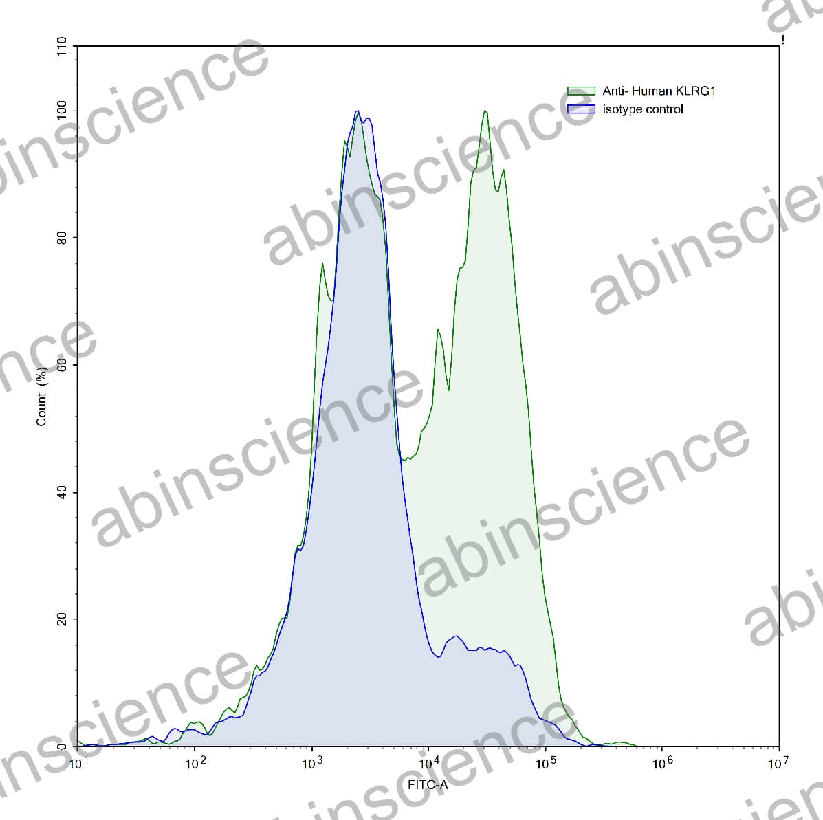 Flow-cytometry using anti-human KLRG1 antibody.Human peripheral blood lymphocytes were stained with an irrelevant antibody (Blue Histogram) or an anti-human KLRG1 antibody monoclonal antibody (Catalog # HP013107 ,Green Histogram) at a concentration of 5 µg/ml for 30 mins at RT. After washing, bound antibody was detected using a FITC conjugated goat anti-mouse antibody (Catalog # MF690414) and cells analysed on a NovoCyte Flow Cytometer. |