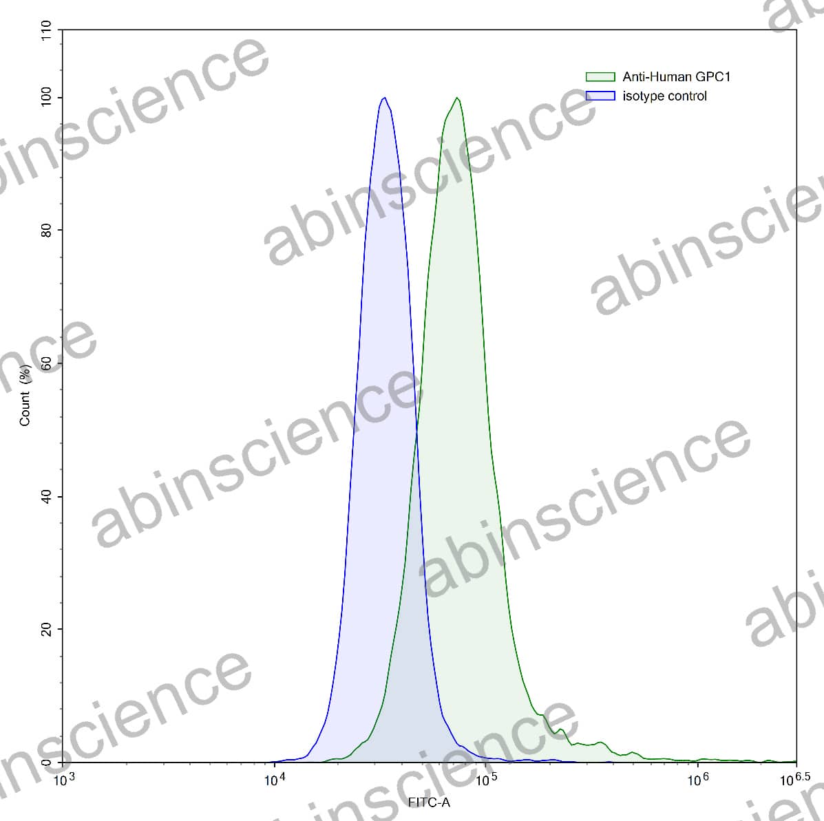Flow-cytometry using anti-human GPC1 antibody.A431 cells were stained with an irrelevant antibody (Blue Histogram) or an anti-human GPC1 antibody monoclonal antibody (Catalog # HW614107 ,Green Histogram) at a concentration of 5 µg/ml for 30 mins at RT. After washing, bound antibody was detected using a FITC conjugated goat anti-human antibody (Catalog # HF690414) and cells analysed on a NovoCyte Flow Cytometer. |