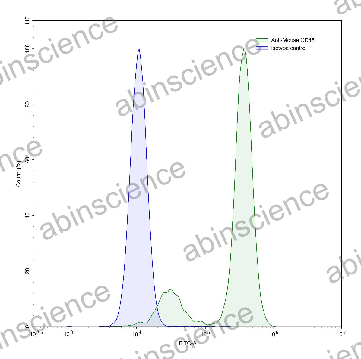 Flow-cytometry using anti-mouse CD45 antibody.Raw264.7 cells were stained with an irrelevant antibody (Blue Histogram) or an anti-mouse CD45 antibody monoclonal antibody (Catalog # MY195107 ,Green Histogram) at a concentration of 5 µg/ml for 30 mins at RT. After washing, bound antibody was detected using a FITC conjugated goat anti-mouse antibody (Catalog # MF690414) and cells analysed on a NovoCyte Flow Cytometer. |