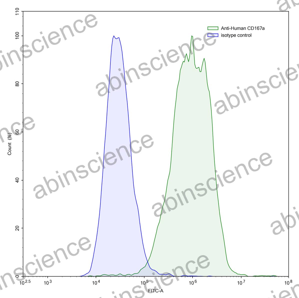 Flow-cytometry using anti-human CD167a antibody.CD167a Transfected CHO cells were stained with an irrelevant antibody (Blue Histogram) or an anti-human CD167a antibody monoclonal antibody (Catalog # HC282307 ,Green Histogram) at a concentration of 5 µg/ml for 30 mins at RT. After washing, bound antibody was detected using a FITC conjugated goat anti-mouse antibody (Catalog # MF690414) and cells analysed on a NovoCyte Flow Cytometer. |