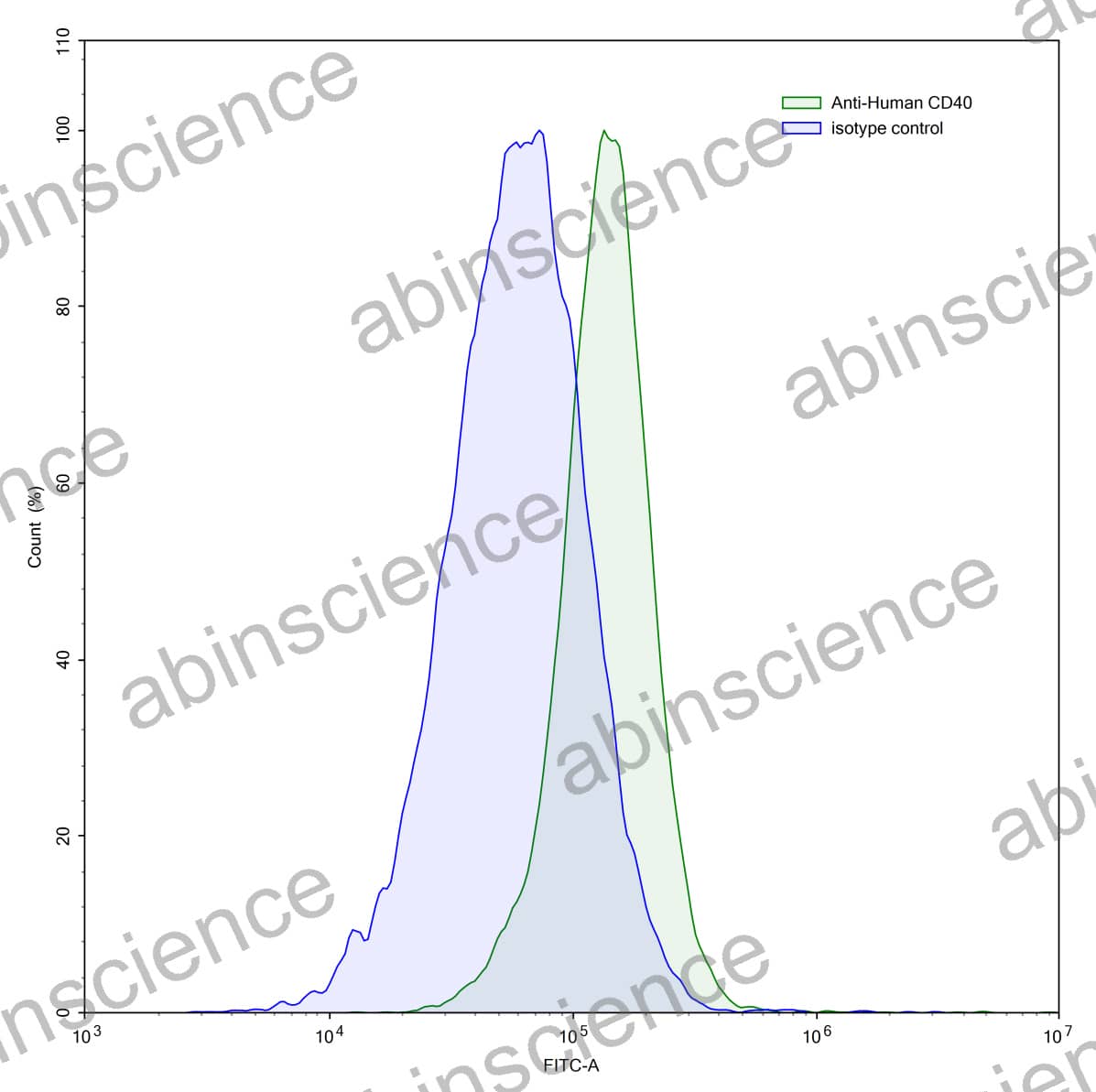 Flow-cytometry using anti-human CD40 antibody.Daudi cells were stained with an irrelevant antibody (Blue Histogram) or an anti-human CD40 antibody monoclonal antibody (Catalog # HB782307 ,Green Histogram) at a concentration of 5 µg/ml for 30 mins at RT. After washing, bound antibody was detected using a FITC conjugated goat anti-mouse antibody (Catalog # MF690414) and cells analysed on a NovoCyte Flow Cytometer. |