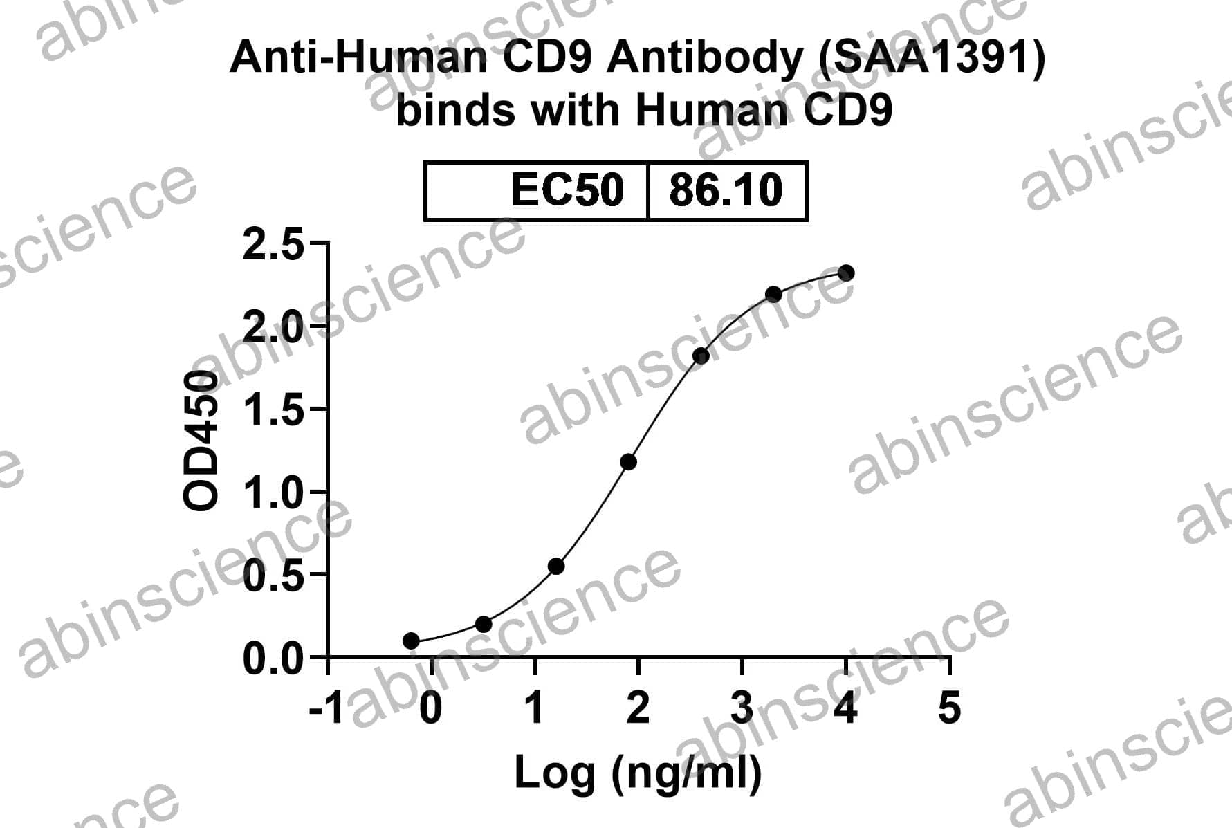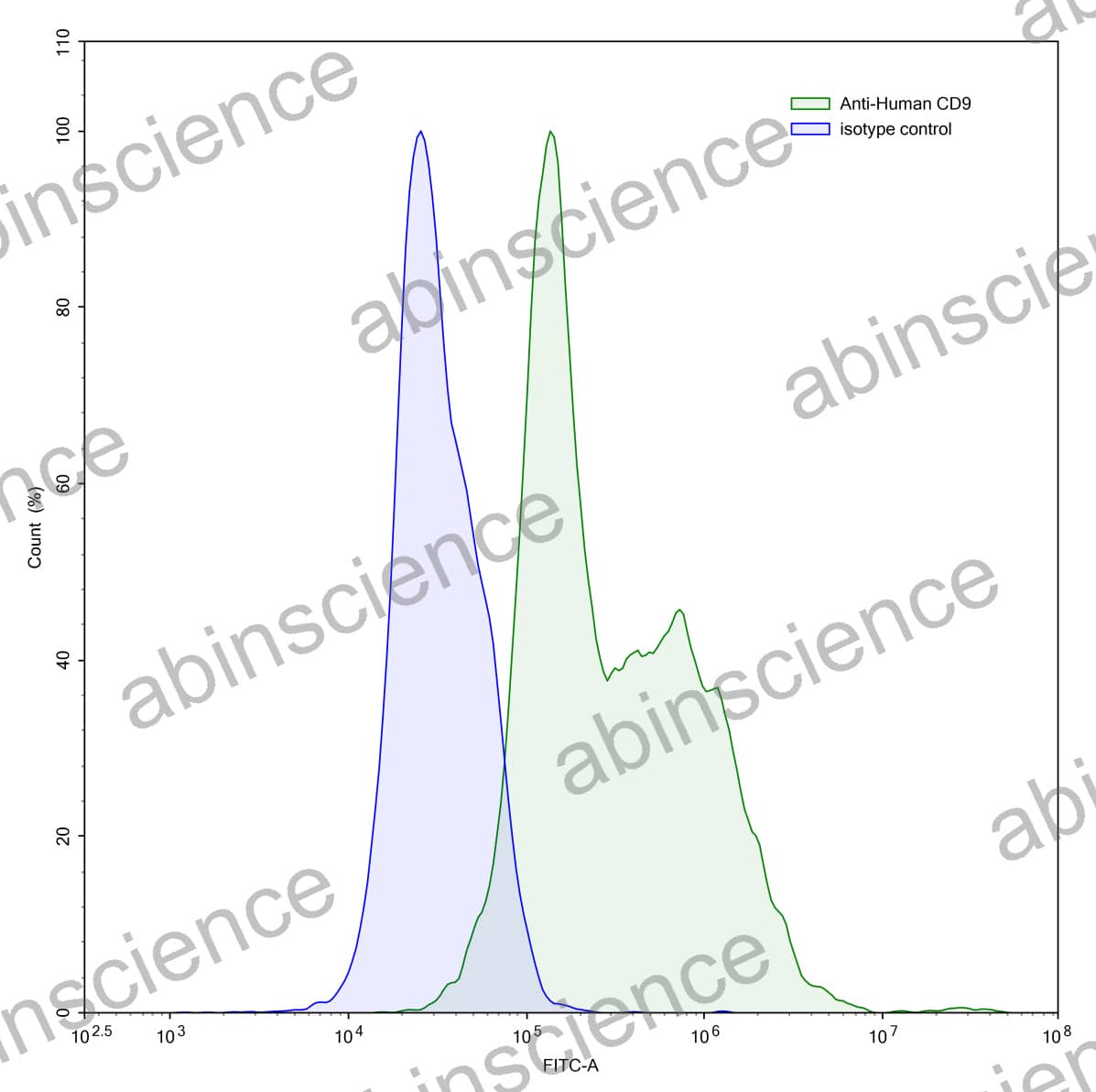 Flow-cytometry using anti-human CD9 antibody.CD9 Transfected CHO cells were stained with an irrelevant antibody (Blue Histogram) or an anti-human CD9 antibody monoclonal antibody (Catalog # HB984207 ,Green Histogram) at a concentration of 5 µg/ml for 30 mins at RT. After washing, bound antibody was detected using a FITC conjugated goat anti-mouse antibody (Catalog # MF690414) and cells analysed on a NovoCyte Flow Cytometer. |