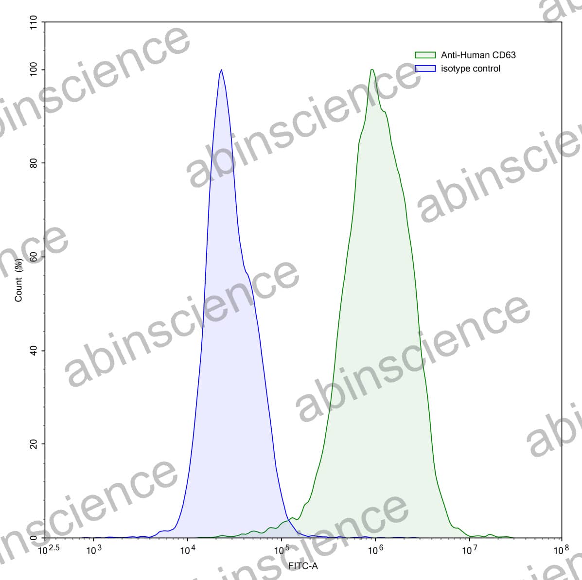 Flow-cytometry using anti-human CD63 antibody.CD63 Transfected CHO cells were stained with an irrelevant antibody (Blue Histogram) or an anti-human CD63 antibody monoclonal antibody (Catalog # HY592207 ,Green Histogram) at a concentration of 5 µg/ml for 30 mins at RT. After washing, bound antibody was detected using a FITC conjugated goat anti-mouse antibody (Catalog # MF690414) and cells analysed on a NovoCyte Flow Cytometer. |