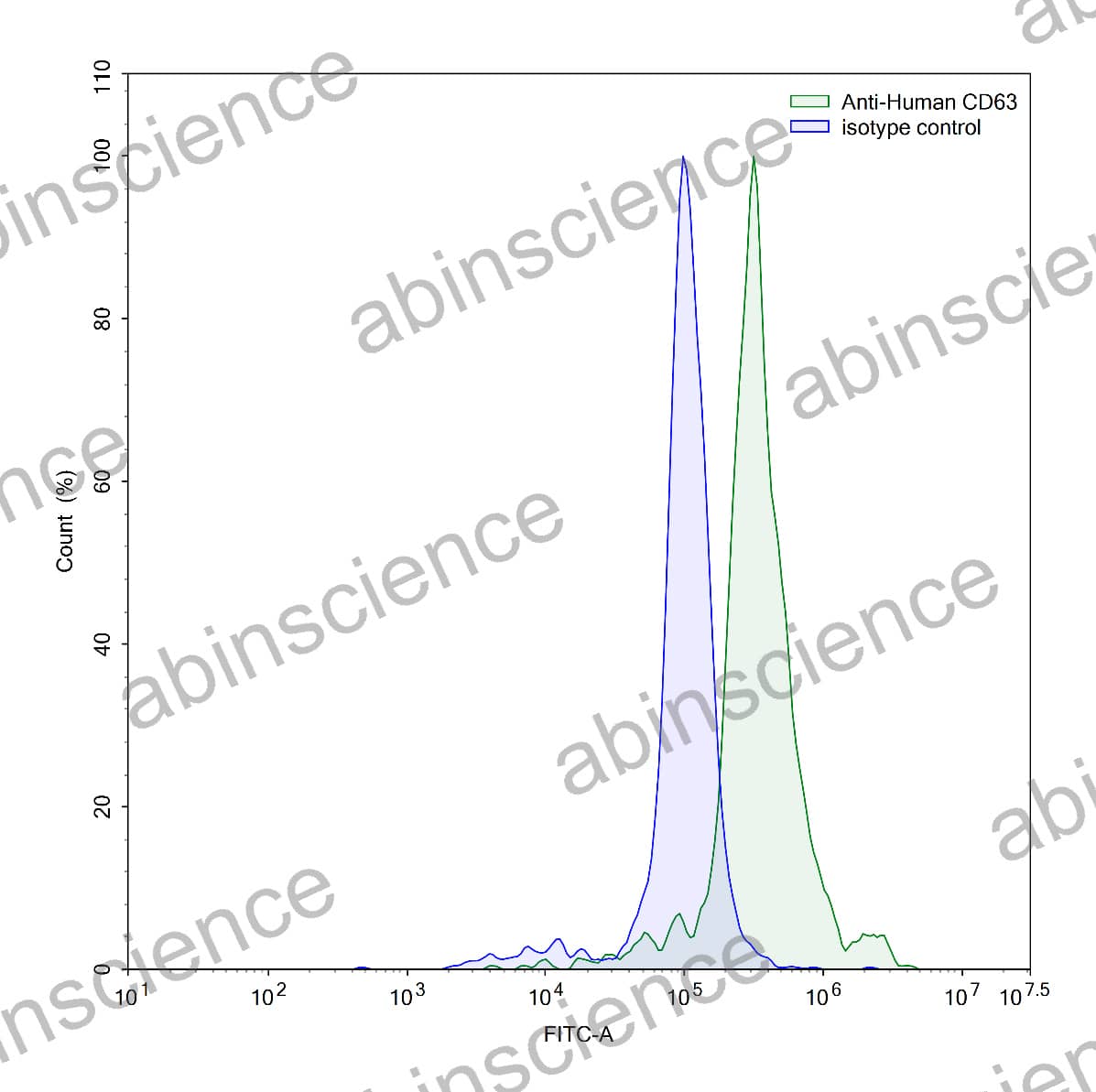 Flow-cytometry using anti-human CD63 antibody.Human peripheral blood monocytes were stained with an irrelevant antibody (Blue Histogram) or an anti-human CD63 antibody monoclonal antibody (Catalog # HY592207 ,Green Histogram) at a concentration of 5 µg/ml for 30 mins at RT. After washing, bound antibody was detected using a FITC conjugated goat anti-mouse antibody (Catalog # MF690414) and cells analysed on a NovoCyte Flow Cytometer. |