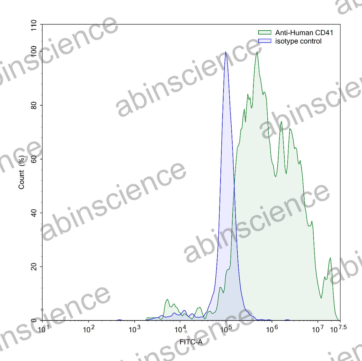 Flow-cytometry using anti-human CD41 antibody.Human peripheral blood monocytes were stained with an irrelevant antibody (Blue Histogram) or an anti-human CD41 antibody monoclonal antibody (Catalog # HY355607 ,Green Histogram) at a concentration of 5 µg/ml for 30 mins at RT. After washing, bound antibody was detected using a FITC conjugated goat anti-mouse antibody (Catalog # MF690414) and cells analysed on a NovoCyte Flow Cytometer. |