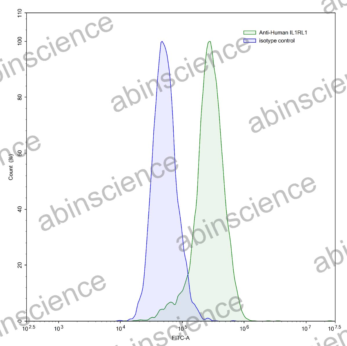 Flow-cytometry using anti-human IL1RL1 antibody.HUVEC cells were stained with an irrelevant antibody (Blue Histogram) or an anti-human IL1RL1 antibody monoclonal antibody (Catalog # HX139307 ,Green Histogram) at a concentration of 5 µg/ml for 30 mins at RT. After washing, bound antibody was detected using a FITC conjugated goat anti-mouse antibody (Catalog # MF690414) and cells analysed on a NovoCyte Flow Cytometer. |