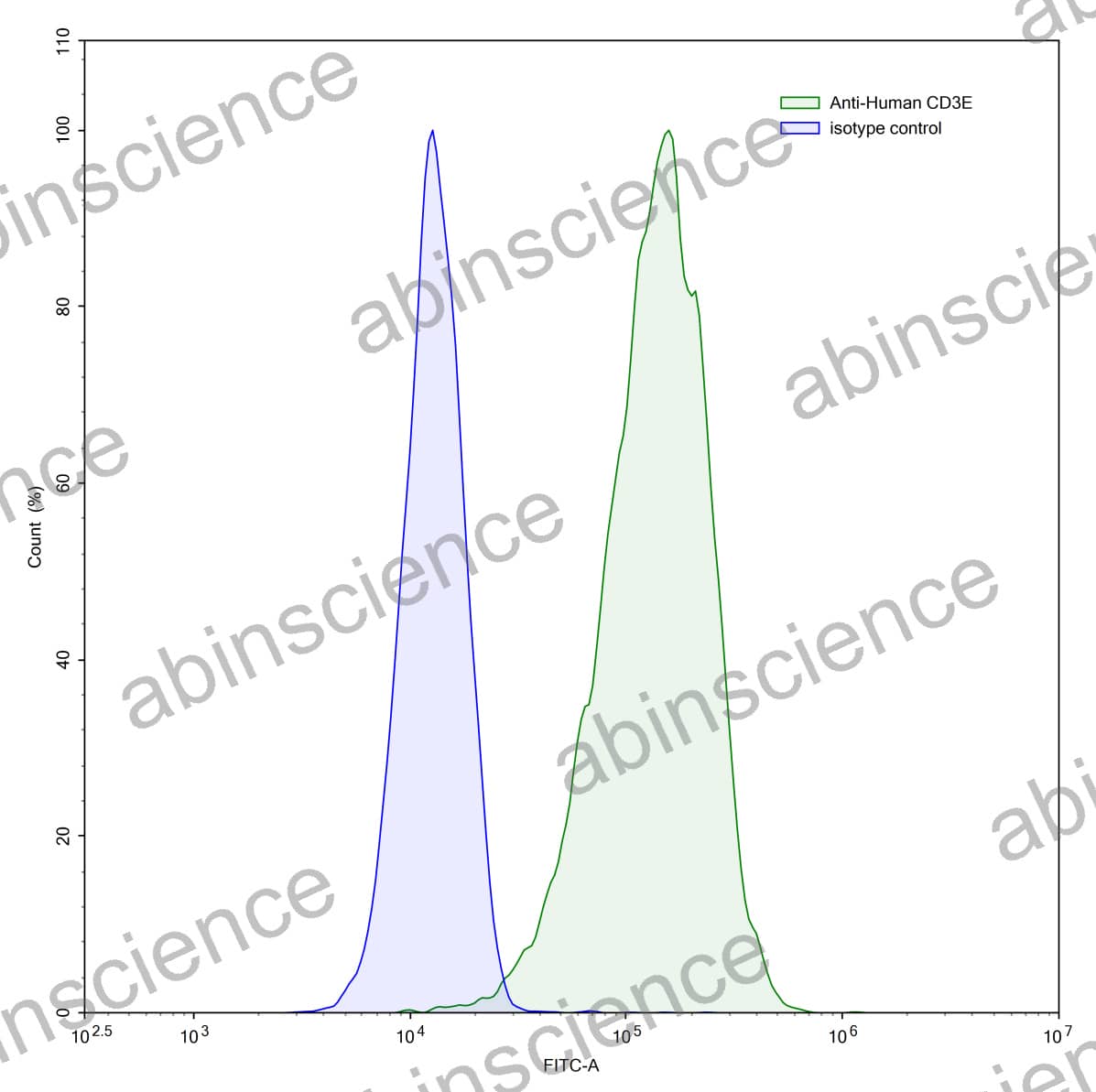 Flow-cytometry using anti-human CD3E antibody.Jurkat cells were stained with an irrelevant antibody (Blue Histogram) or an anti-human CD3E antibody monoclonal antibody (Catalog # HY057607 ,Green Histogram) at a concentration of 5 µg/ml for 30 mins at RT. After washing, bound antibody was detected using a FITC conjugated goat anti-human antibody (Catalog # HF690414) and cells analysed on a NovoCyte Flow Cytometer. |