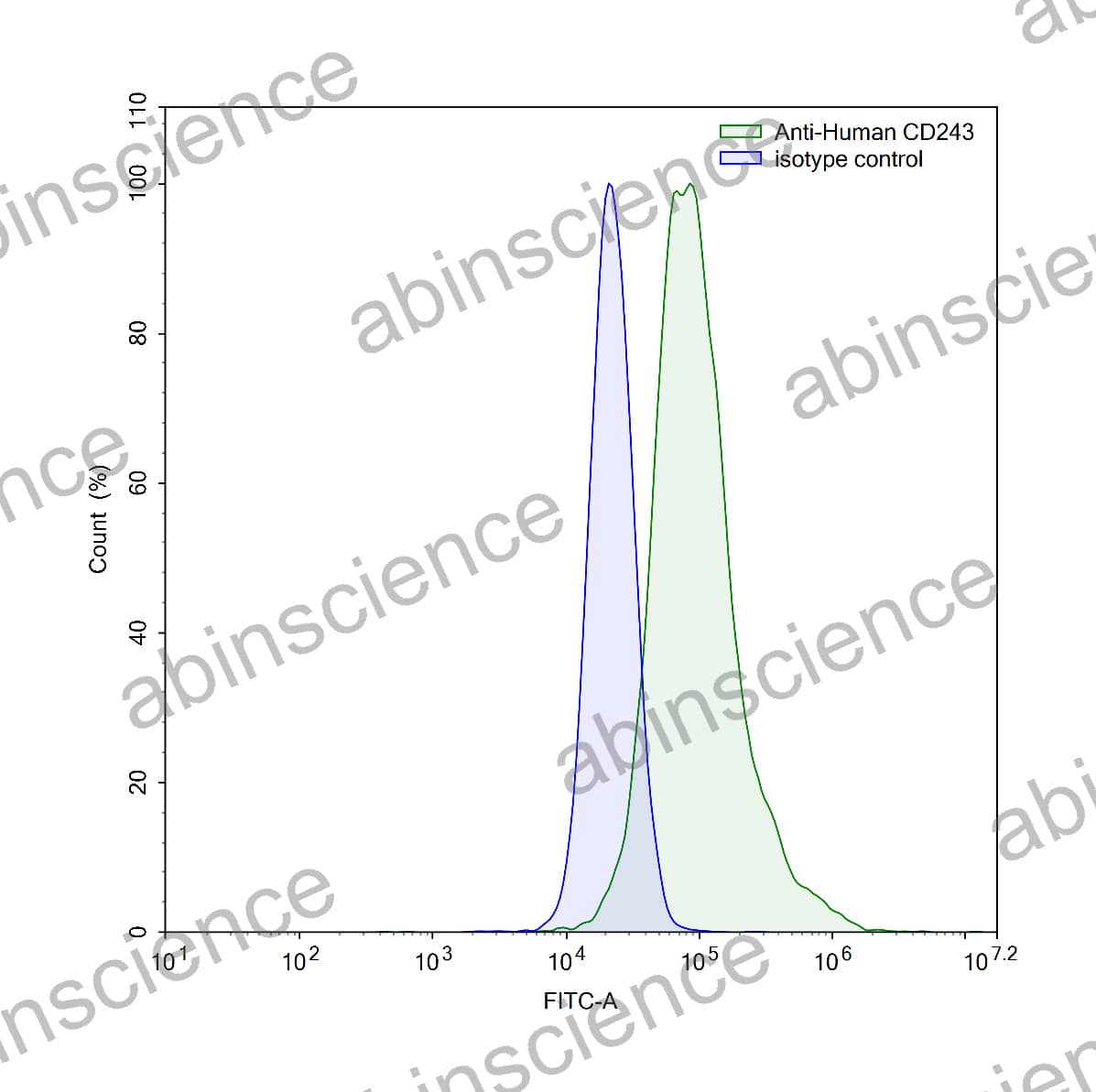 Flow-cytometry using anti-human CD243 antibody.RPMI-8226 cells were stained with an irrelevant antibody (Blue Histogram) or an anti-human CD243 antibody monoclonal antibody (Catalog # HY466207 ,Green Histogram) at a concentration of 5 µg/ml for 30 mins at RT. After washing, bound antibody was detected using a FITC conjugated goat anti-mouse antibody (Catalog # MF690414) and cells analysed on a NovoCyte Flow Cytometer. |