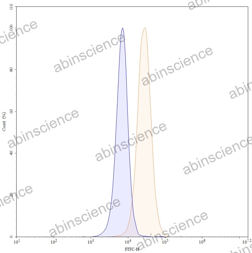Flow-cytometry using FITC anti-human CD71 antibody. U937 cells were stained with an irrelevant antibody (Blue Histogram) or an FITC anti-human CD71 monoclonal antibody (Catalog: HY036217, Yellow Histogram) at a concentration of 5 µg/ml for 30 mins at RT. After washing, and cells analysed on a NovoCyte Flow Cytometer.