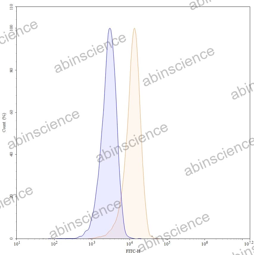 Flow-cytometry using FITC anti-human CD18 antibody. Jurkat cells were stained with an irrelevant antibody (Blue Histogram) or an FITC anti-human CD18 monoclonal antibody (Catalog: HY378117, Yellow Histogram) at a concentration of 5 µg/ml for 30 mins at RT. After washing, and cells analysed on a NovoCyte Flow Cytometer. |