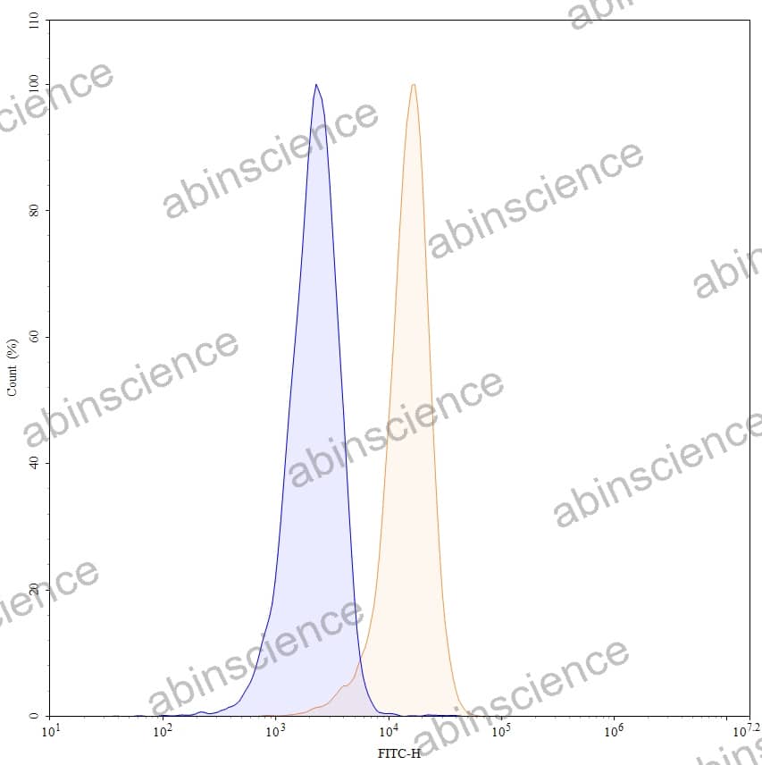 Flow-cytometry using FITC anti-human CD18 antibody. Jurkat cells were stained with an irrelevant antibody (Blue Histogram) or an FITC anti-human CD18 monoclonal antibody (Catalog: HY378617, Yellow Histogram) at a concentration of 5 µg/ml for 30 mins at RT. After washing, and cells analysed on a NovoCyte Flow Cytometer. |