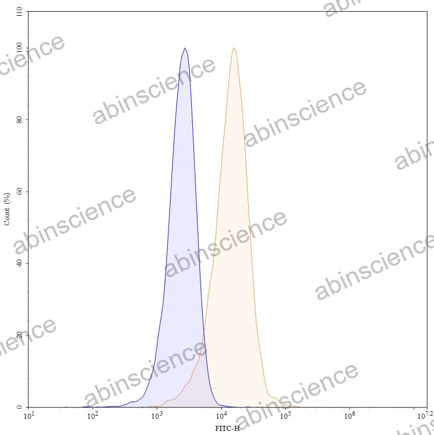 Flow-cytometry using FITC anti-human CD1a antibody. Jurkat cells were stained with an irrelevant antibody (Blue Histogram) or an FITC anti-human CD1a monoclonal antibody (Catalog: HY043117, Yellow Histogram) at a concentration of 5 µg/ml for 30 mins at RT. After washing, and cells analysed on a NovoCyte Flow Cytometer. |