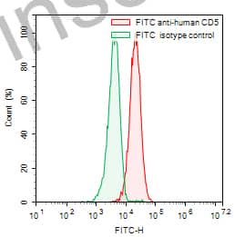 Flow-cytometry using FITC anti-human CD5 antibody. Jurkat cells were stained with an irrelevant antibody (Green Histogram) or a FITC anti-human CD5 antibody monoclonal antibody (Catalog # HY046117, Red Histogram) at a concentration of 5 µg/ml for 30 mins at RT. After washing, cells analysed on a NovoCyte Flow Cytometer. |