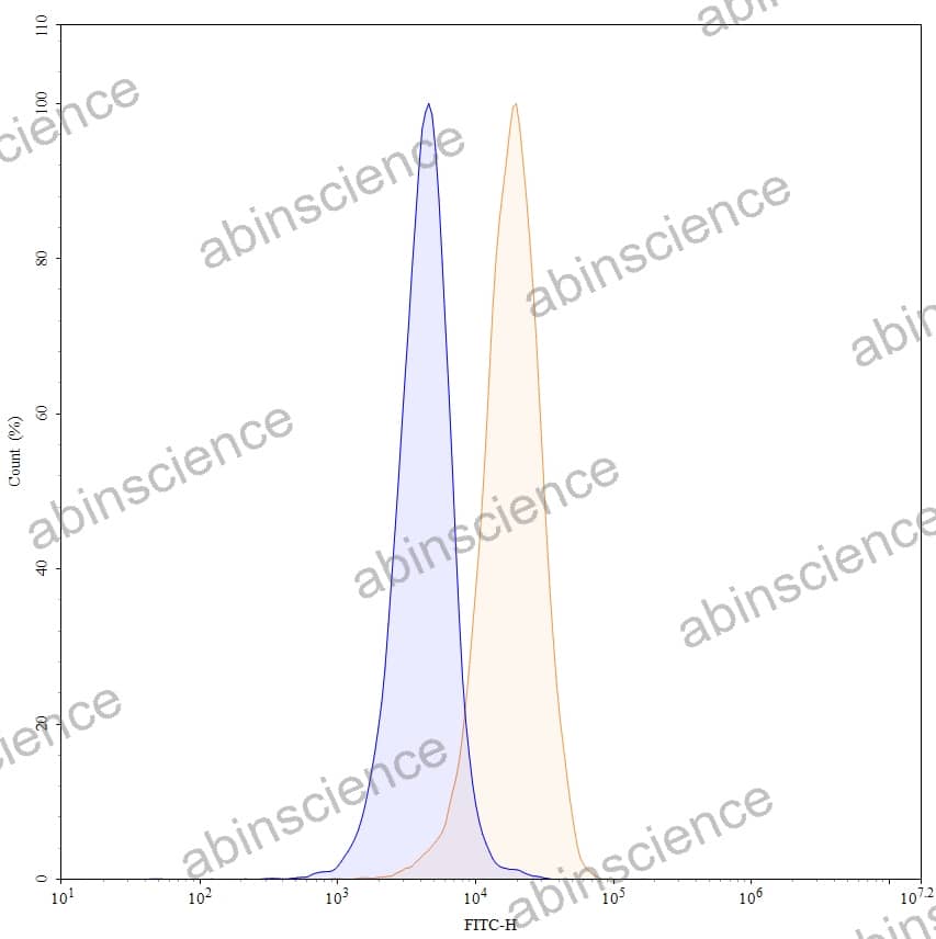 Flow-cytometry using FITC anti-human CD2 antibody. Jurkat cells were stained with an irrelevant antibody (Blue Histogram) or an FITC anti-human CD2 monoclonal antibody (Catalog: HY113117, Yellow Histogram) at a concentration of 5 µg/ml for 30 mins at RT. After washing, and cells analysed on a NovoCyte Flow Cytometer. |