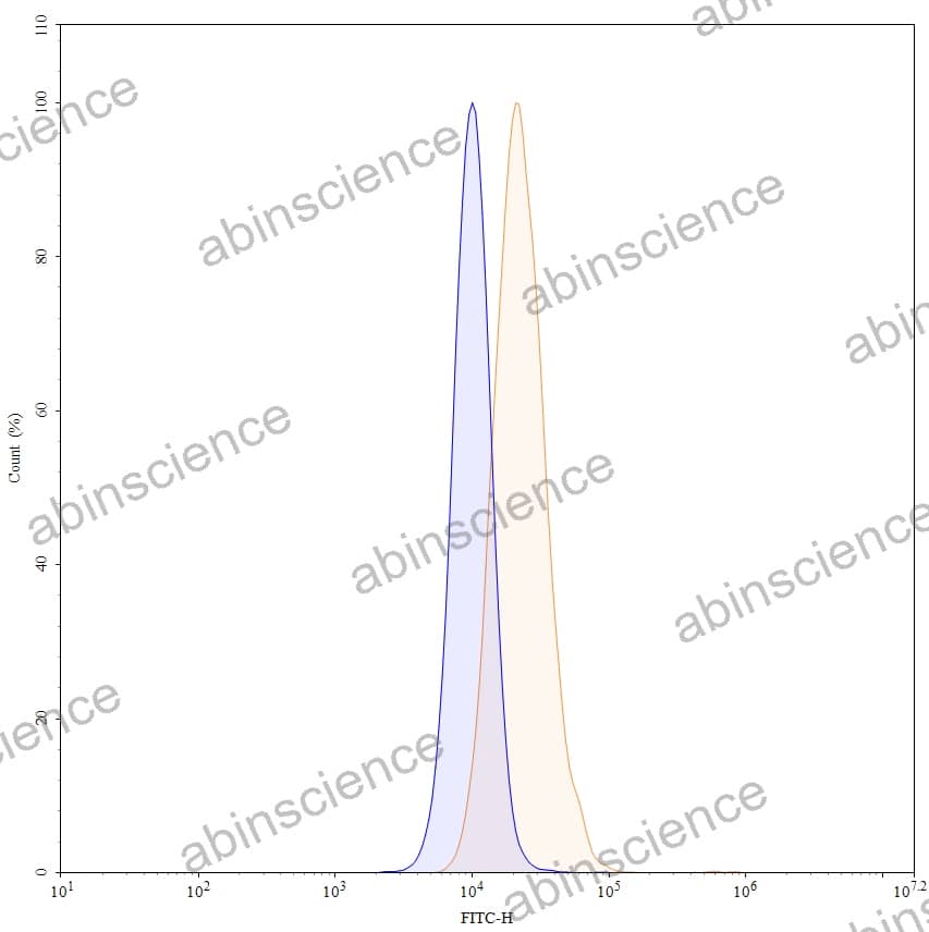 Flow-cytometry using FITC anti-human CD228 antibody. A431 cells were stained with an irrelevant antibody (Blue Histogram) or an FITC anti-human CD228 monoclonal antibody (Catalog: HY094117, Yellow Histogram) at a concentration of 5 µg/ml for 30 mins at RT. After washing, and cells analysed on a NovoCyte Flow Cytometer. |
