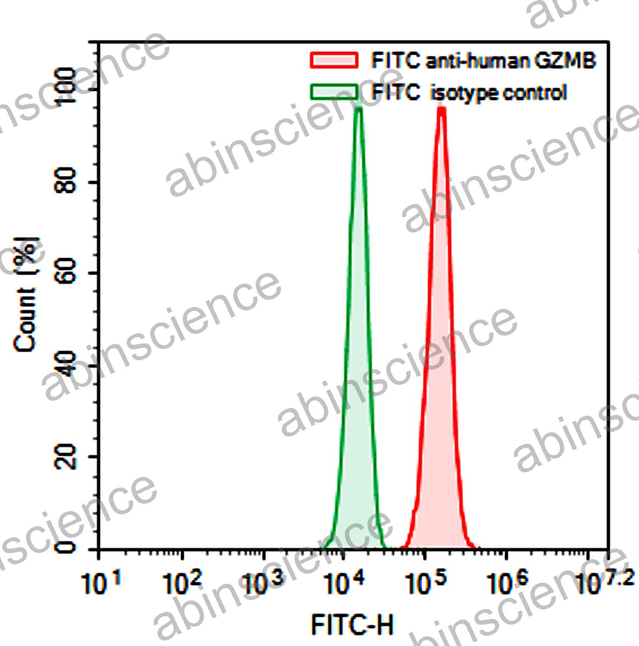 Flow-cytometry using FITC anti-Human GZMB antibody. BXPC3 cells were stained with an irrelevant antibody (Green Histogram) or a FITC anti-Human GZMB antibody monoclonal antibody (Catalog # HY574217 , Red Histogram) at a concentration of 5 µg/ml for 30 mins at RT. After washing, cells analysed on a NovoCyte Flow Cytometer. |