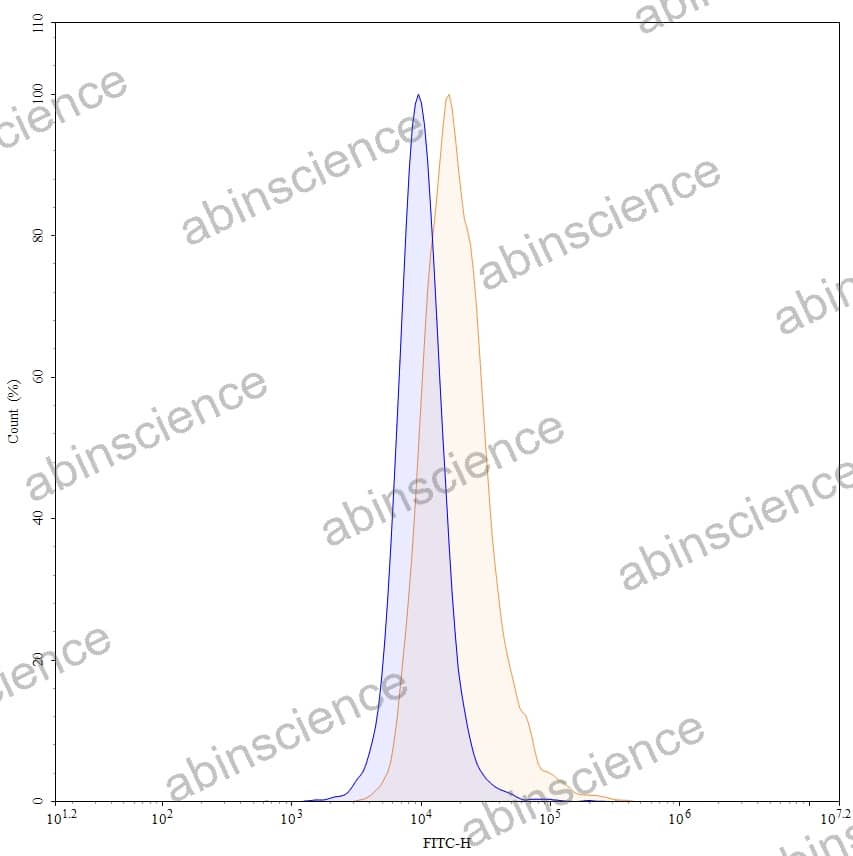 Flow-cytometry using FITC anti-human CD66a antibody. HT-29 cells were stained with an irrelevant antibody (Blue Histogram) or an FITC anti-human CD66a monoclonal antibody (Catalog: HB880117, Yellow Histogram) at a concentration of 5 µg/ml for 30 mins at RT. After washing, cells analysed on a NovoCyte Flow Cytometer. |