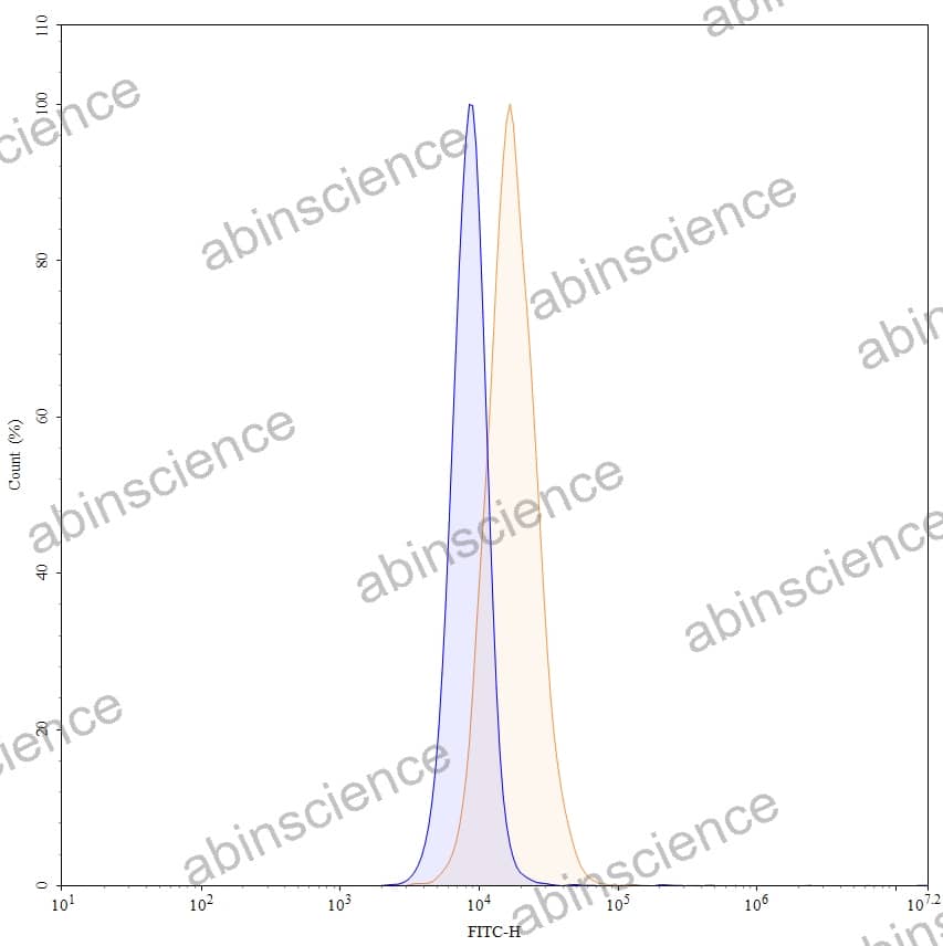 Flow-cytometry using FITC anti-human CD140a antibody. MG-63 cells were stained with an irrelevant antibody (Blue Histogram) or an FITC anti-human CD140a monoclonal antibody (Catalog: HB927217, Yellow Histogram) at a concentration of 5 µg/ml for 30 mins at RT. After washing, and cells analysed on a NovoCyte Flow Cytometer. |