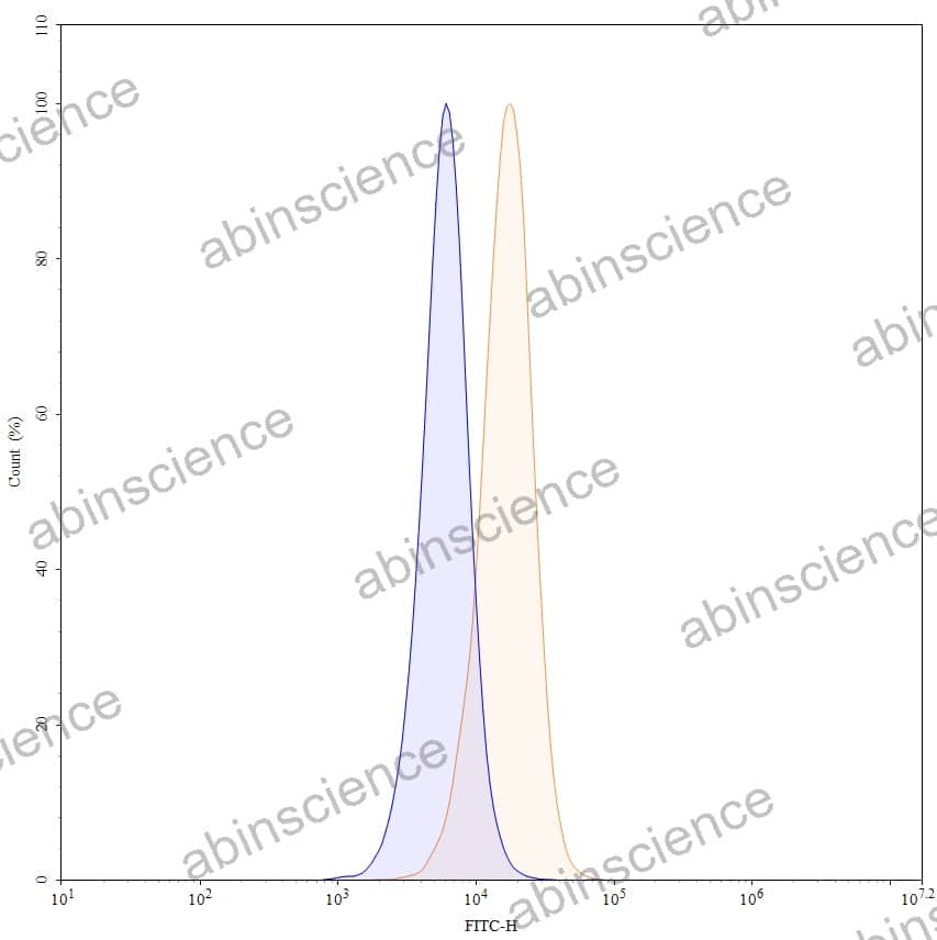 Flow-cytometry using FITC anti-human CD182 antibody. THP-1 cells were stained with an irrelevant antibody (Blue Histogram) or an FITC anti-human CD182 monoclonal antibody (Catalog: HB243117, Yellow Histogram) at a concentration of 5 µg/ml for 30 mins at RT. After washing, and cells analysed on a NovoCyte Flow Cytometer. |