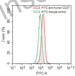 Flow-cytometry using FITC anti-human CD27 antibody. Raji cells were stained with an irrelevant antibody (Green Histogram) or a FITC anti-human CD27 antibody monoclonal antibody (Catalog # HB796117, Red Histogram) at a concentration of 5 µg/ml for 30 mins at RT. After washing, cells analysed on a NovoCyte Flow Cytometer.