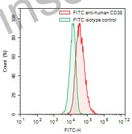 Flow-cytometry using FITC anti-human CD38 antibody. RPMI-8226 cells were stained with an irrelevant antibody (Green Histogram) or a FITC anti-human CD38 antibody monoclonal antibody (Catalog # HB691317, Red Histogram) at a concentration of 5 µg/ml for 30 mins at RT. After washing, cells analysed on a NovoCyte Flow Cytometer. |