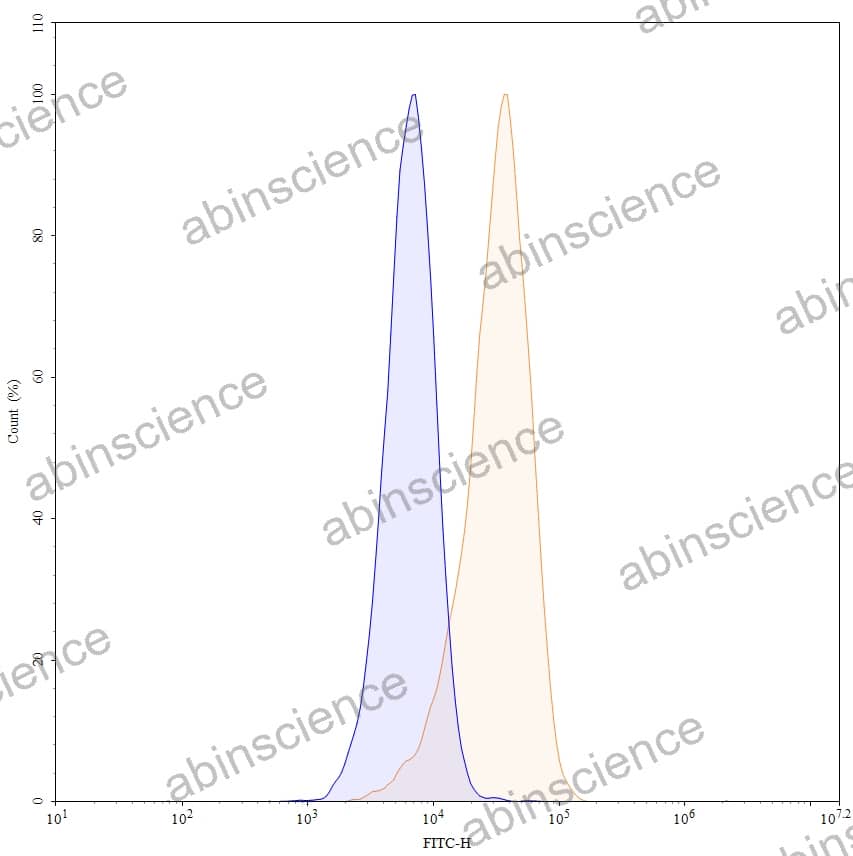 Flow-cytometry using FITC anti-human CD79β antibody. Daudi cells were stained with an irrelevant antibody (Blue Histogram) or an FITC anti-human CD79β monoclonal antibody (Catalog: HW431217, Yellow Histogram) at a concentration of 5 µg/ml for 30 mins at RT. After washing, cells analysed on a NovoCyte Flow Cytometer. |